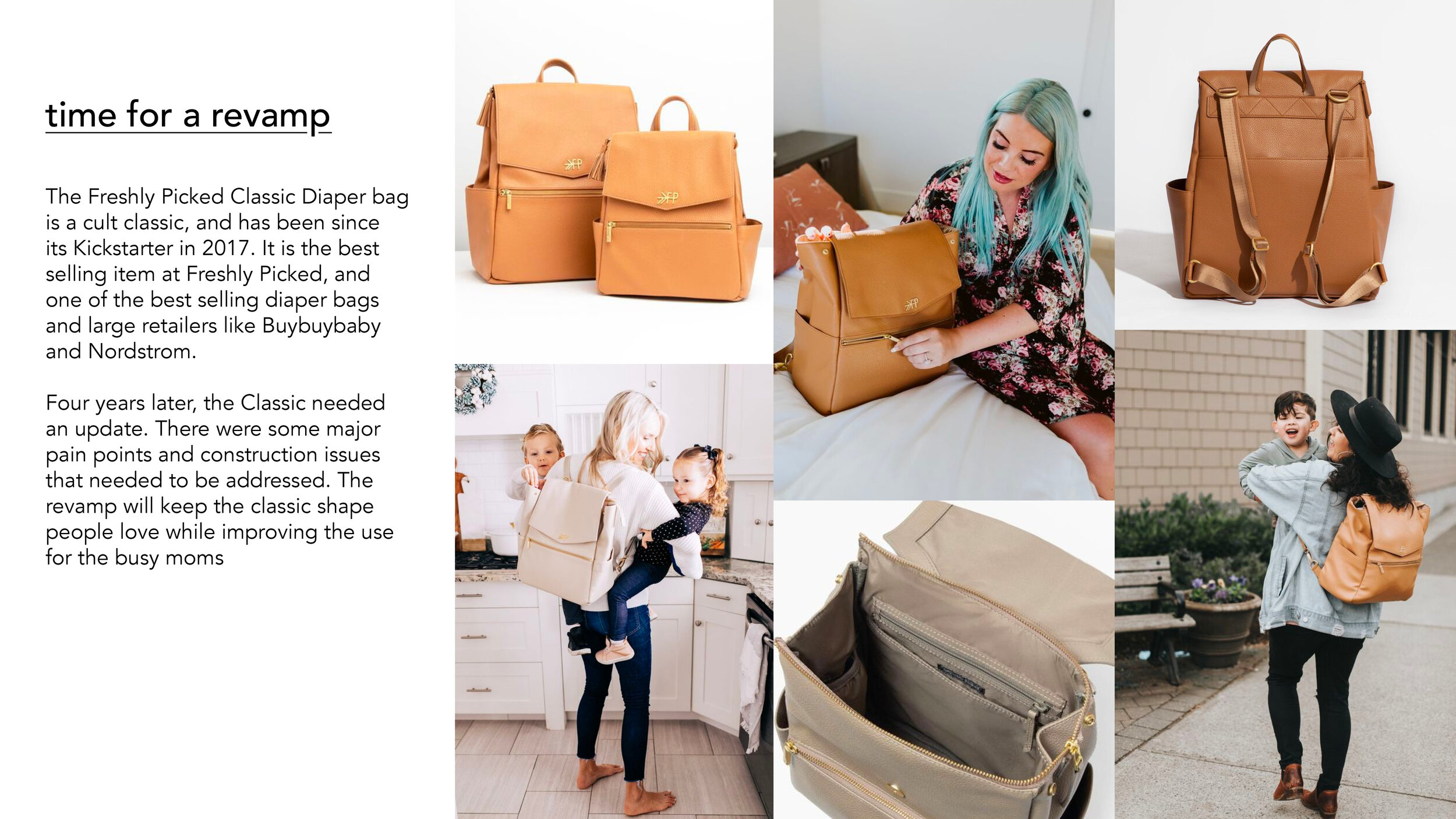 In 2017, Freshly Picked launched its first diaper bag called the Classic Diaper Bag. Since then, Freshly Picked Diaper Bags have become some of the most sought after bags in the category, with a thriving ecomm business and selling out in stores like Nordstrom, Bloomingdales, and BuyBuyBaby. In 2019, I took over designing all of Freshly Picked’s diaper bags. Below is some of the bags that I designed for the Classic Line (PU). Photos and videos are provided by the creative and marketing department at Freshly Picked.